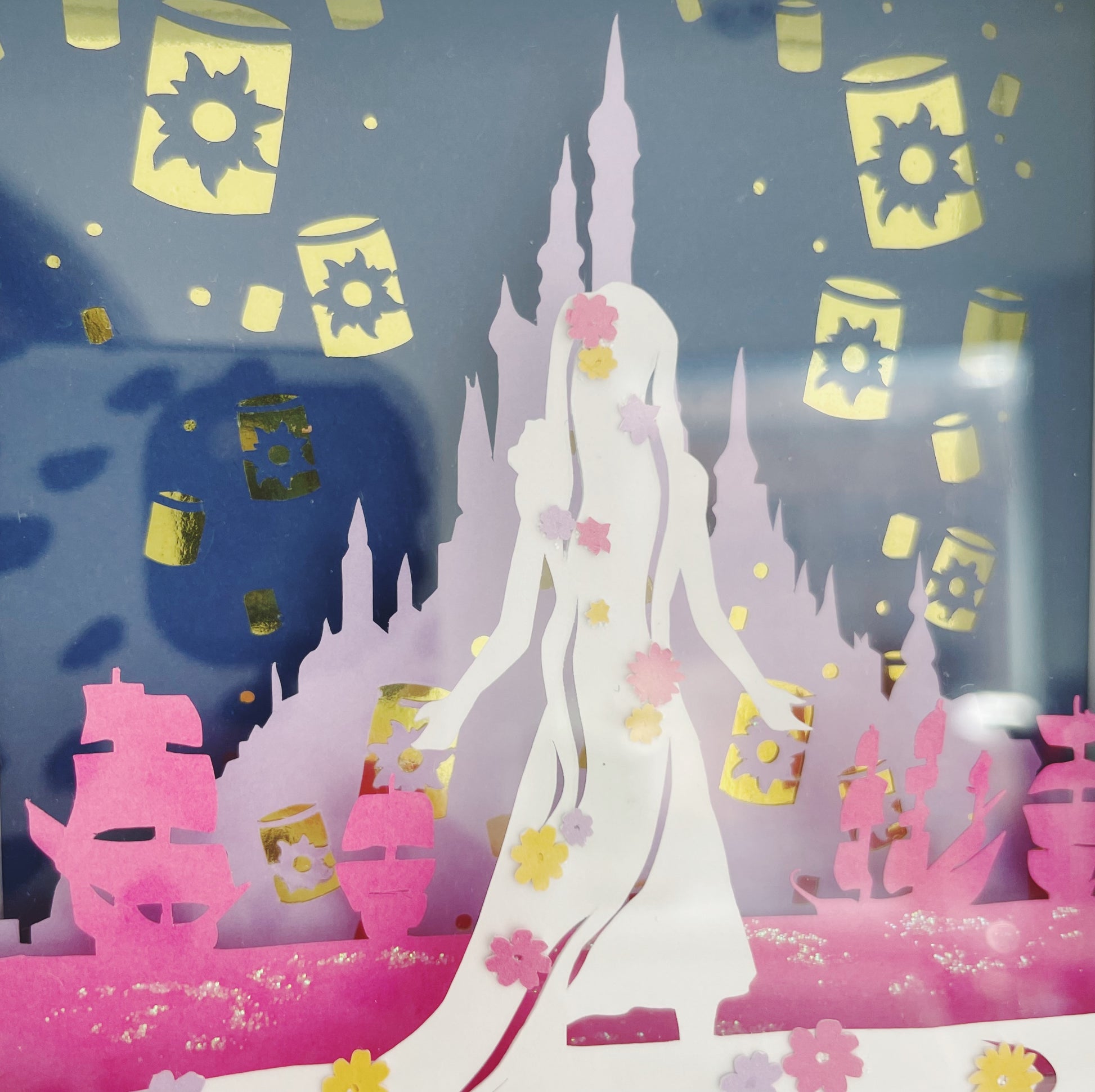 Rapunzel Mini frame complete with dazzling gold lanterns, and teeny mini papercut flowers through her hair.