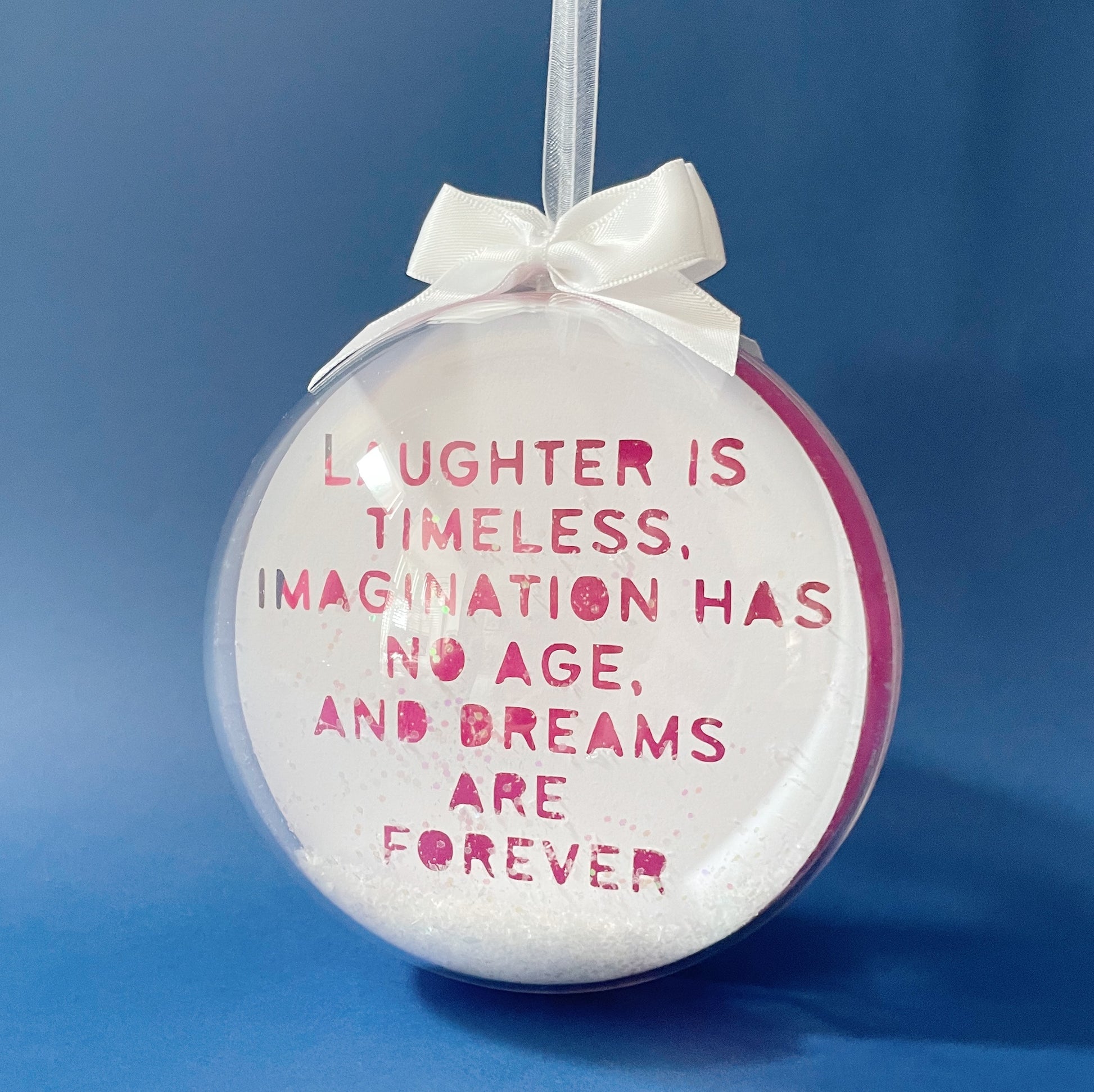 Text on the back of the bauble reads 'Laughter is timeless, imagination has no age, and dreams are forever'